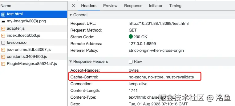 在原来的基础上测试,只需要启动带上-c-1 参数,代表不缓存,可以看到请求 html 带上了 no-store,而只有 html 的 cache-control 影响了 bfcache,单纯设置图片资源的 cache-control 不会影响