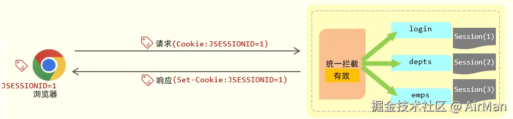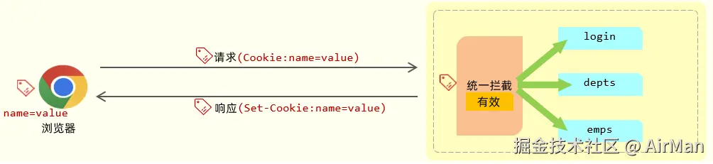 那为了方便在请求中携带 Cookie,我们还需要遵循 HTP 协议。Cookie 也是 HTP 协议当中所支持的技术,各大浏览器厂商都支持该标准。所以浏览器接受到响应回来的 Cookie 时,会自动的将 Cookie 存储在浏览器中,后续的每一次请求中,浏览器会自动的将本地存储的 Cookie 携带到服务端中。服务端接收到请求中,可以通过解释 Cookie,判断瀛湖的信息了,这样就解决了在不同的请求中进行身份信息共享的问题。
