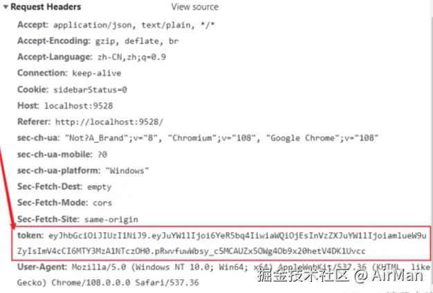 之后再发起一个查询数据的请求,此时可以看到在请求头中包含一个 token(JWT令牌),后续的每一次请求当中,都会将这个令牌携带到服务端。一般情况下,默认都是把 token 放在 Authorization 的键值对中。当然也可以自定义请求头中的键值对,如下