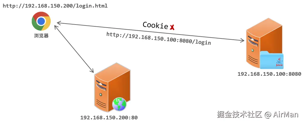 因为现在的项目都是前后端分离的,前端部署在服务器 192.168.150.200 上,端口 80,后端部署在 192.168.150.100上,端口 8080,所以因为跨域的原因,服务器设置的 Cookie 将无法使用。