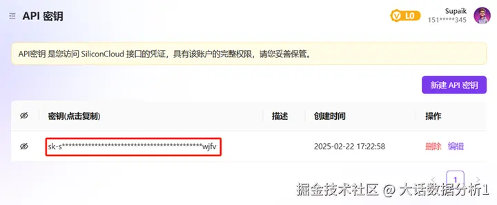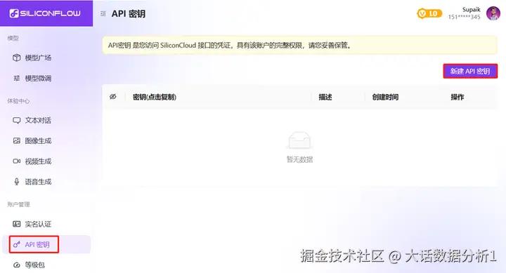 进入主页以后,在左侧的导航栏里面点击API密钥,点击新建API密钥生成API密钥。