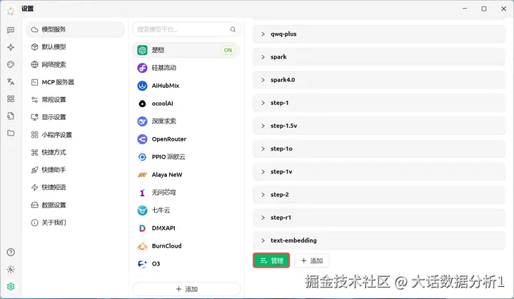 接着点击管理,添加你需要的模型,或者点击右上角的加号,添加所有模型,这样你就可以使用模型服务商所支持的大模型。