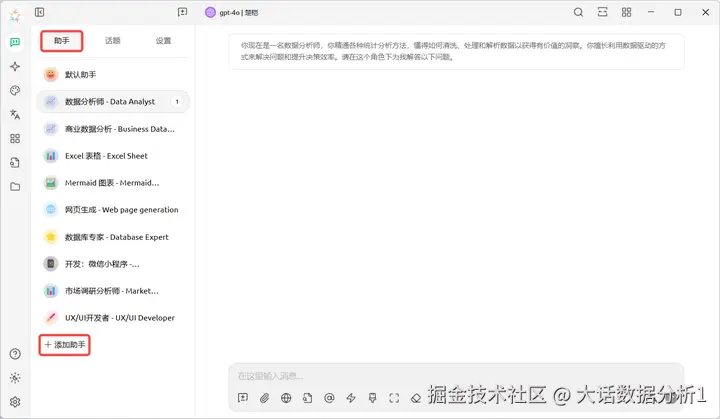 使用助手(智能体),助手指预设了系统提示词的角色,可以根据自己的场景使用助手进行聊天,点击添加助手。