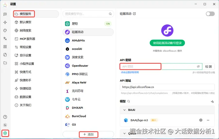 在官网下载CherryStudio安装包,然后双击程序安装,打开CherryStudio软件以后,默认的是硅基流动,如果你想换其他模型服务,在设置里面点击模型服务,点击添加,输入API地址和API密钥即可。