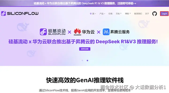 获取硅基流动的API也很容易,打开硅基流动的官网,官网地址如下,点击Log in注册账号。