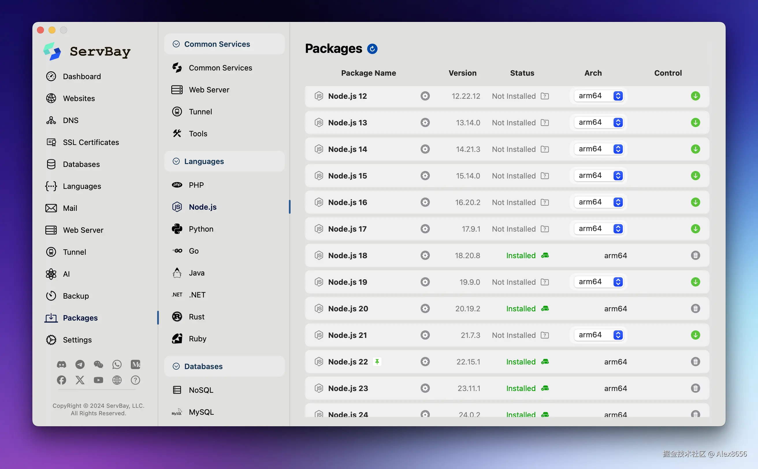 - (对应 Node.js 焦虑) 你想继续用你最熟悉的 Node.js v22 写 API?没问题,在 ServBay 面板里点一下 Node.js,版本选好,服务秒启。