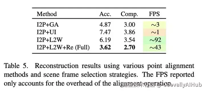 通过对 Replica 数据集进行消融研究,评估了 L2W 模型的有效性。首先使用 I2P 模型生成窗口大小为 11 的每窗口重建。然后使用不同的方法将局部点对齐到统一的协同帧: 表 5. 使用不同点对齐方法和场景帧选择策略的重建结果。报告的 FPS 仅包括对齐操作的开销。