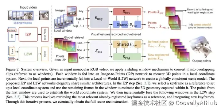 图像到点 (I2P): 将输入视频分割成重叠的短片段(滑动窗口)。该模块一次性处理窗口内的多帧图像(受DUSt3R启发但更高效),直接回归预测该局部窗口的密集三维点云图。
