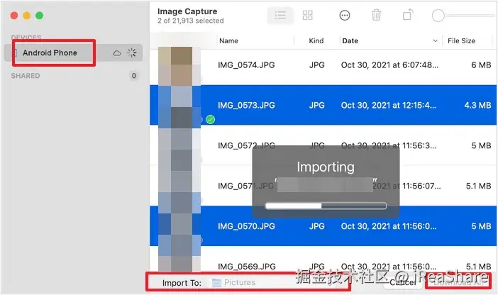 Image Capture 是一款 macOS 内置应用程序,可让您从相机和其他设备(包括 Android 手机,例如三星 Galaxy 手机和其他不同品牌的 Android 设备)导入照片和视频。此外,它还支持通过 USB 连接直接导入照片。