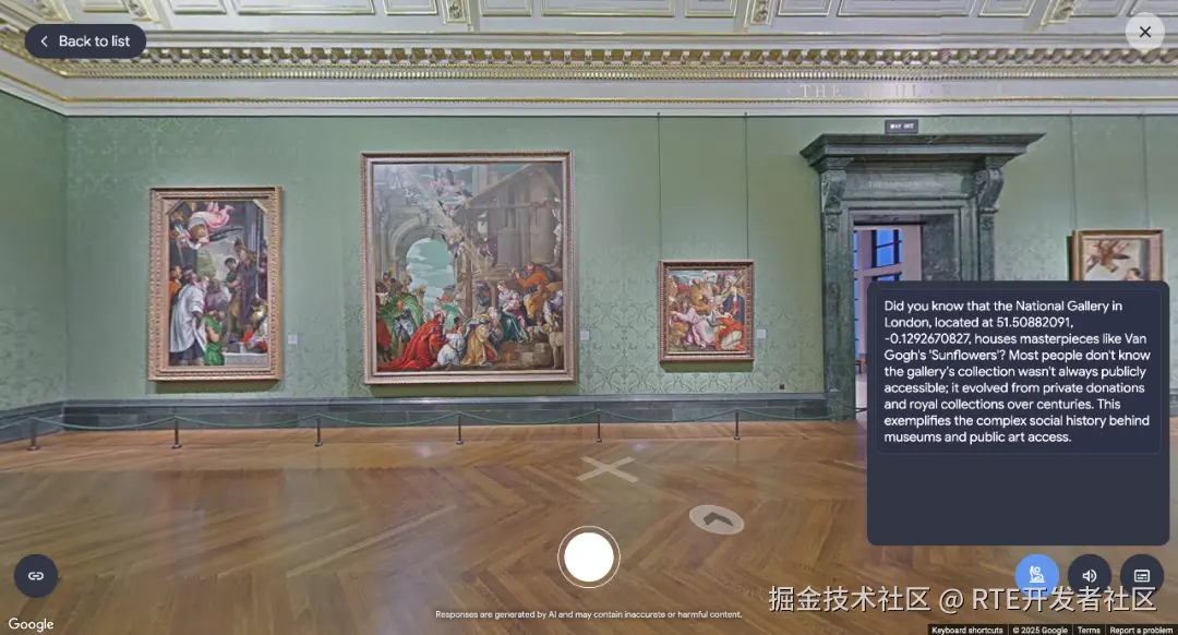 点击地图上的坐标,即可进入对应地点的沉浸式街景视图。AI 导游会通过语音讲解该地点的背景信息,比如某所博物馆的建筑风格、历史典故,甚至细节到展厅里壁纸的设计灵感。