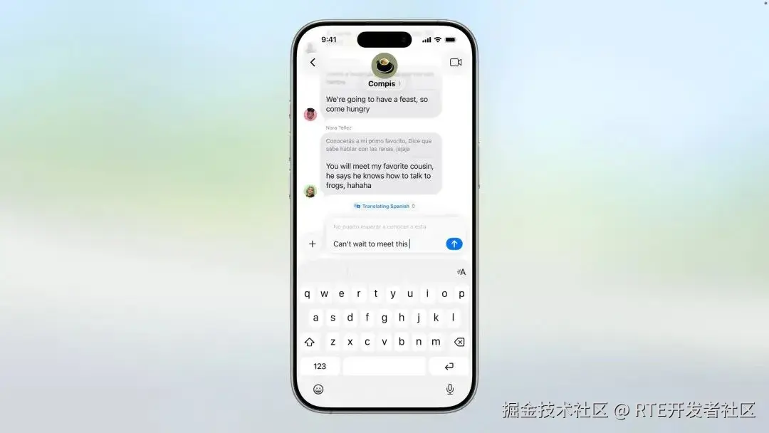 由 Apple Intelligence 驱动的实时翻译功能将通过 API 接口,向所有第三方开发者开放,开发者可以将实时翻译功能集成到任何通讯软件中。