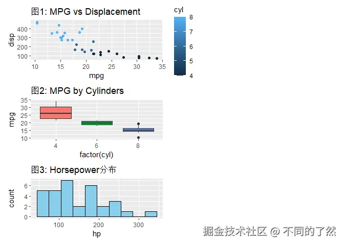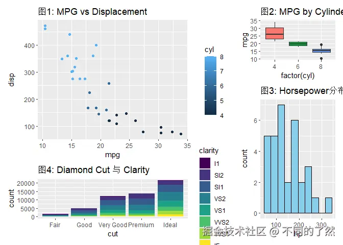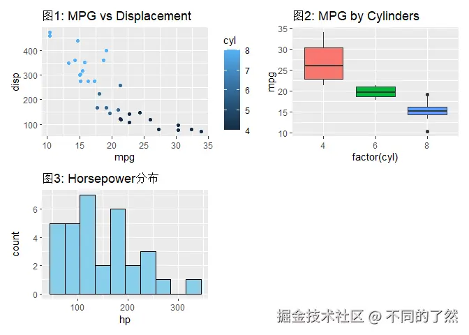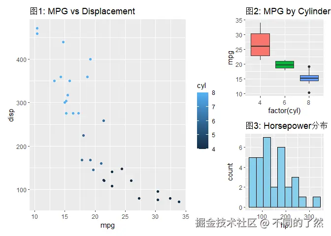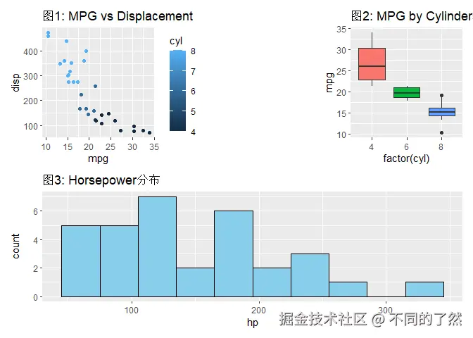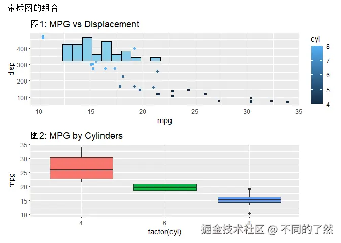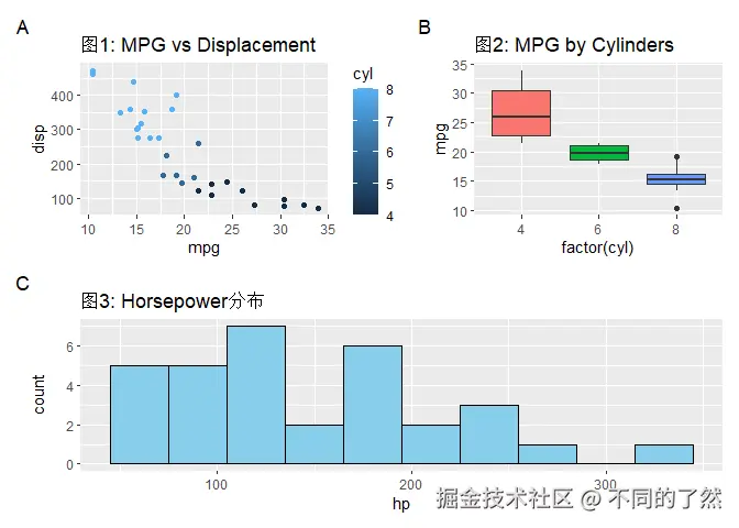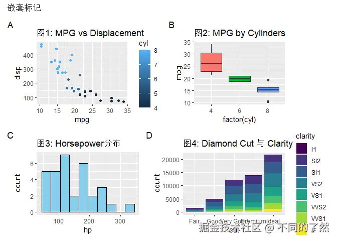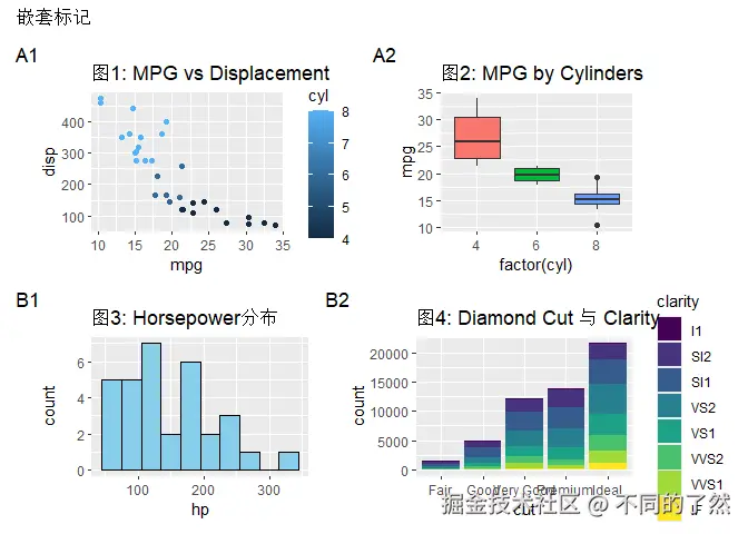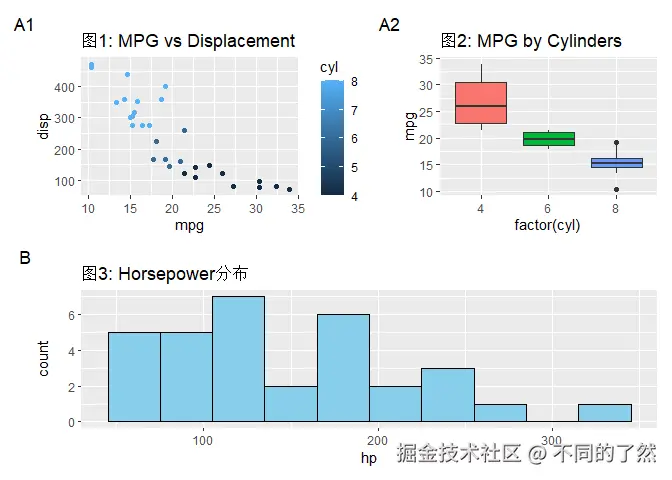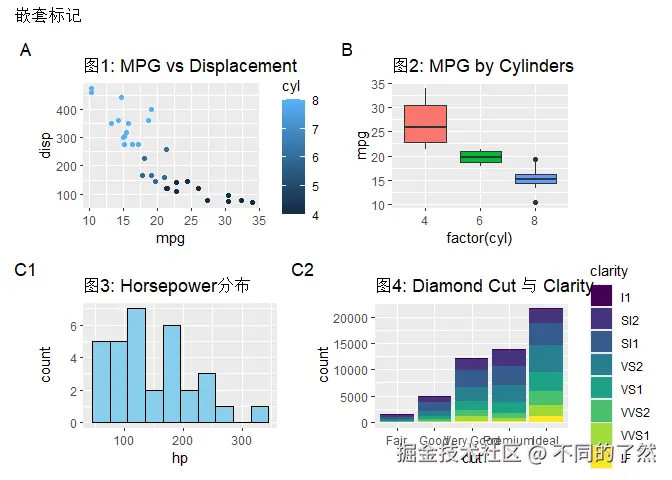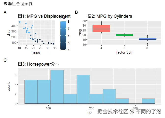 +,/,|进行基本的图表组合。 plot_layout()用于精细控制网格布局、尺寸和图例。plot_annotation()添加整体标题、说明和自动标记。wrap_plots()方便地组合图列表。plot_spacer()添加空白占位符。inset_element()创建图内插图。- 通过