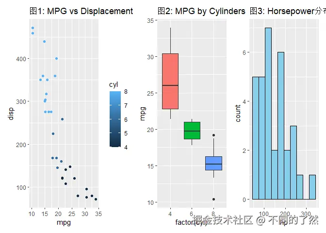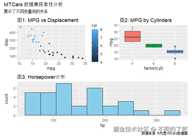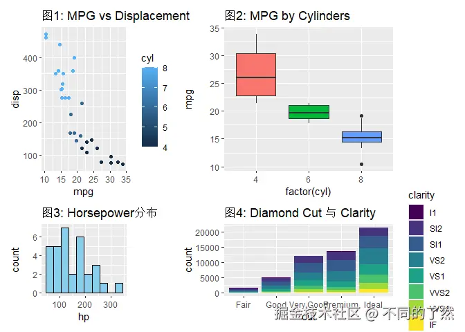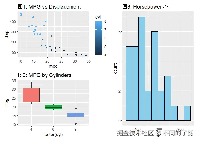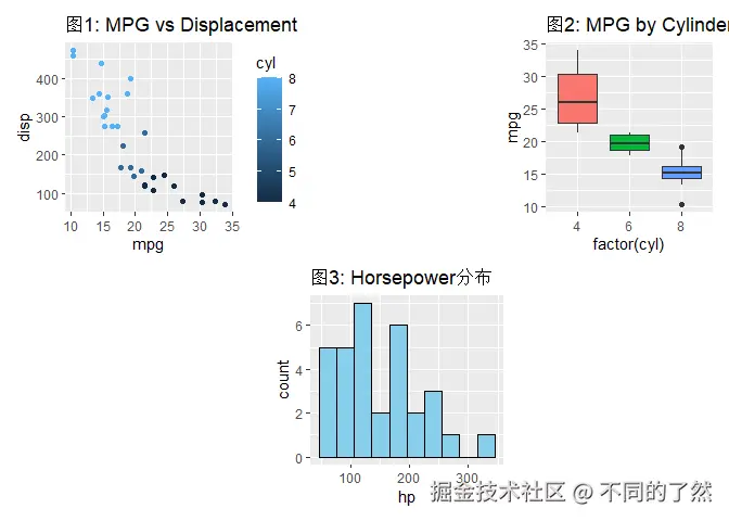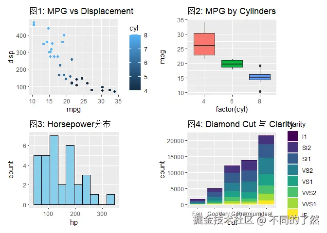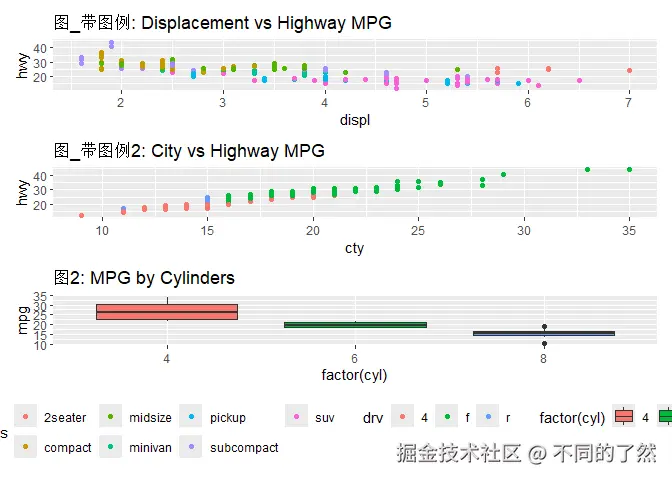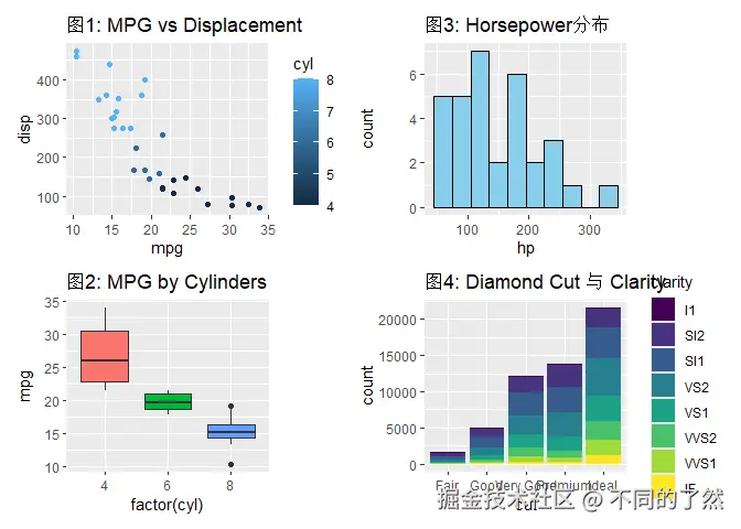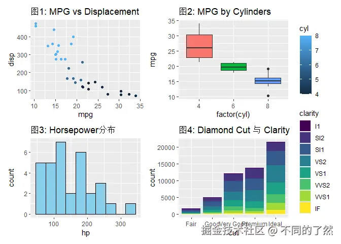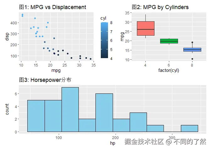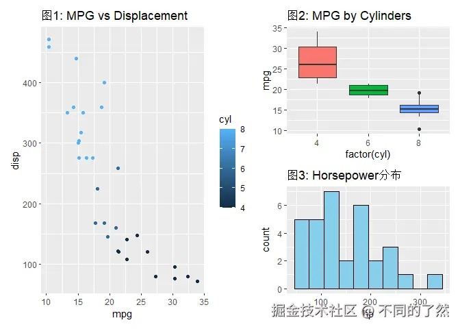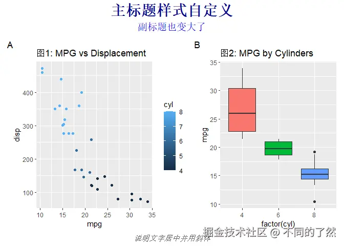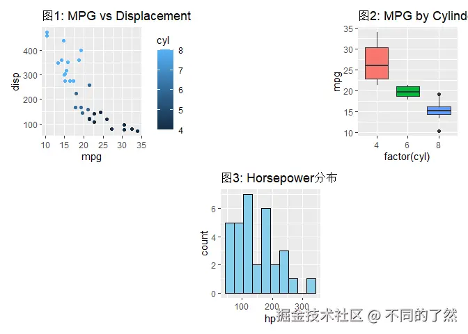 +,/,|进行基本的图表组合。 plot_layout()用于精细控制网格布局、尺寸和图例。plot_annotation()添加整体标题、说明和自动标记。wrap_plots()方便地组合图列表。plot_spacer()添加空白占位符。inset_element()创建图内插图。- 通过