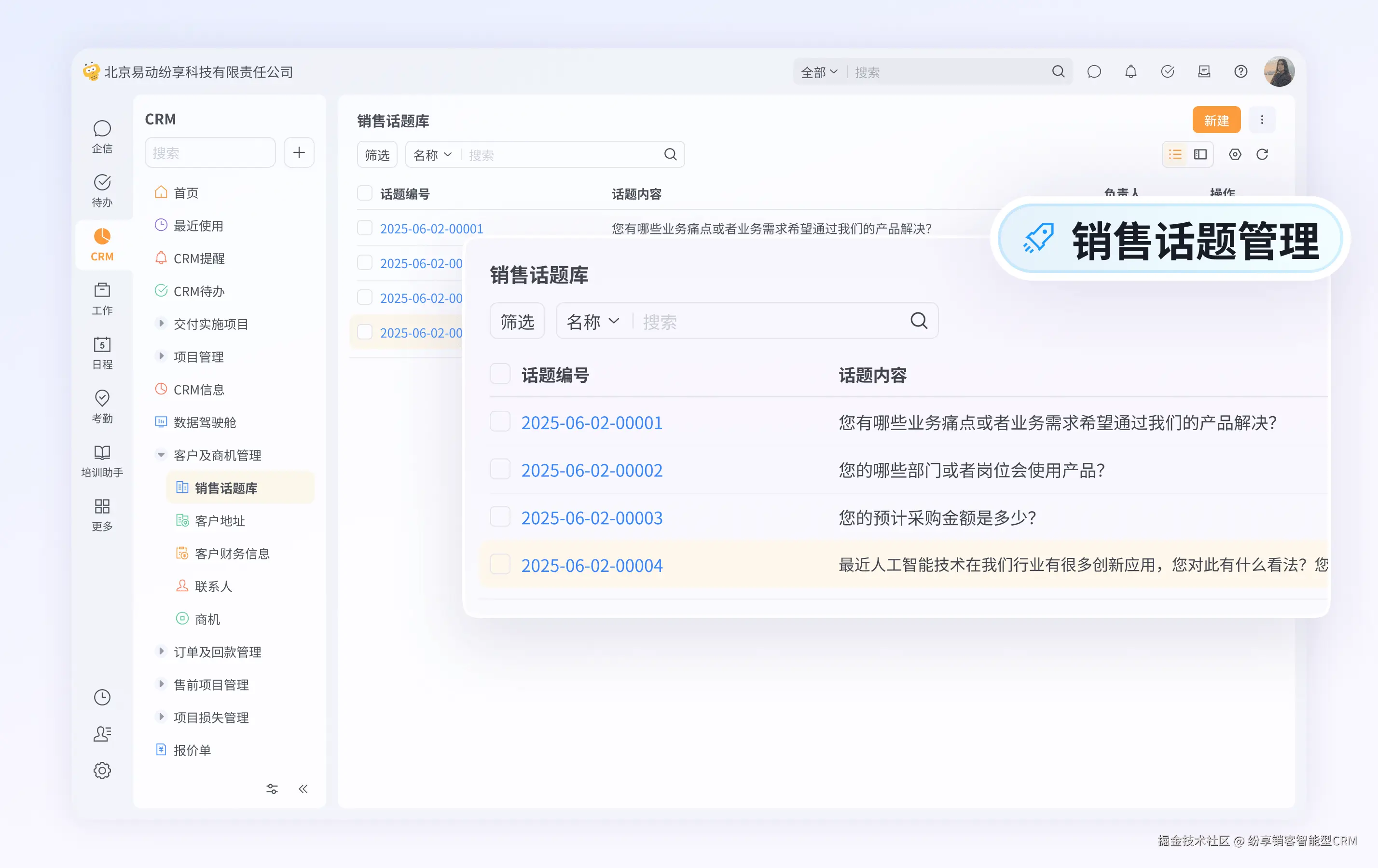 互动前, 【客户互动Agent】支持企业根据最佳销售经验及方法论构建销售话题库,并可基于客户特征及商机阶段,为预沟通客户生成建议话题,确保客户互动前明确沟通目标。