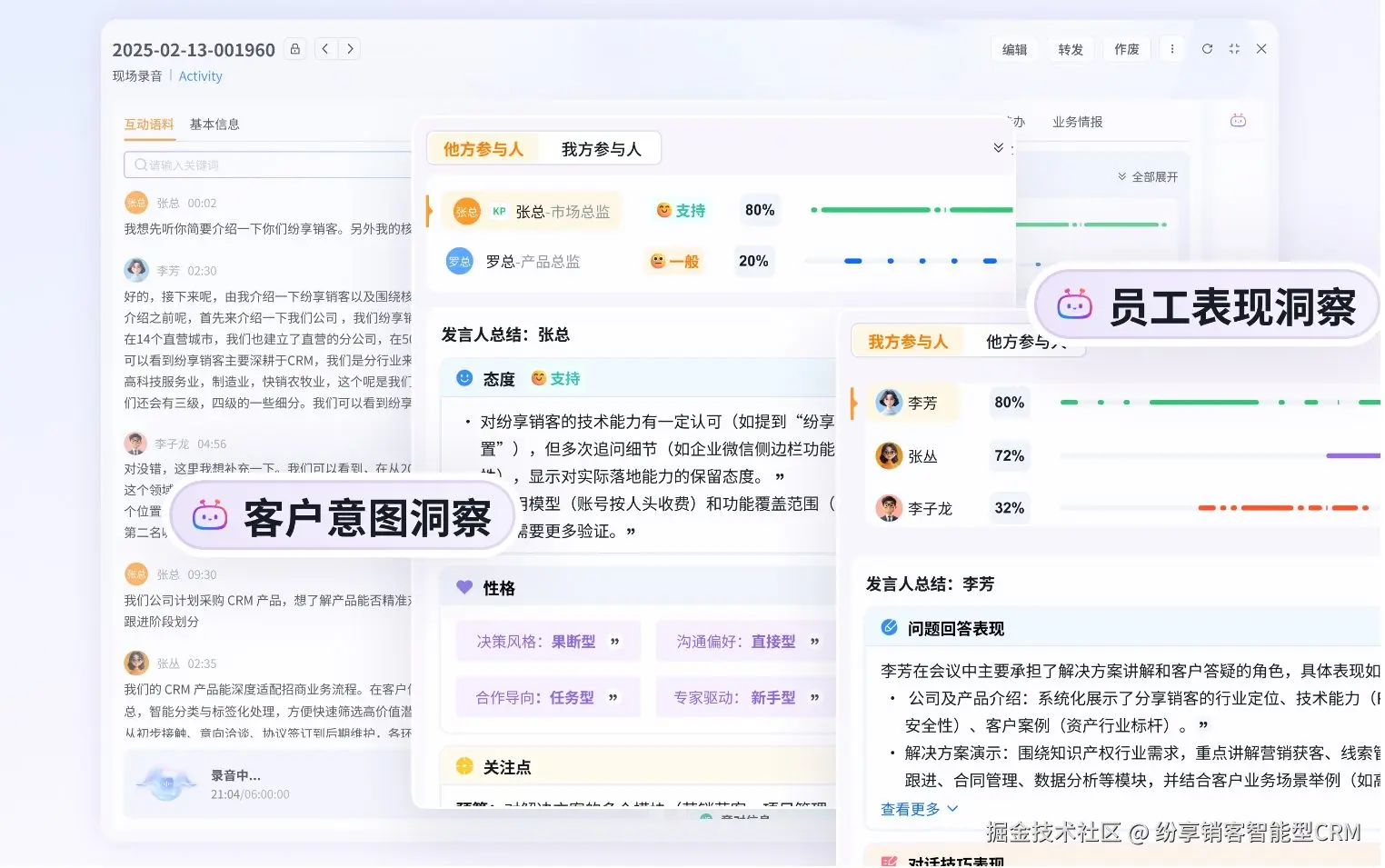 系统将自动记录客方发言频率,洞察客户关注点、疑意及决策倾向,并对销售互动表现、互动技巧及互动 SOP 执行情况进行评估,以提升复盘及制定跟进策略的准确性。