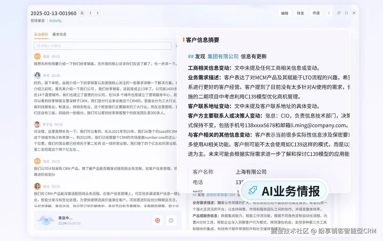 互动后,【客户互动Agent】将识别商机相关资讯,如客户提到的企业规划、新参会人、交叉销售机会等,并支持将信息存入 CRM 以完善客户画像或进行后续管理。
