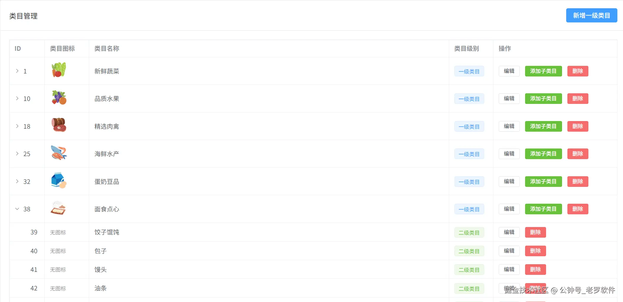 在后端管理你可以随意的对类目进行编辑删除,一级类目需要一个小图标, 二级类目是不用的。