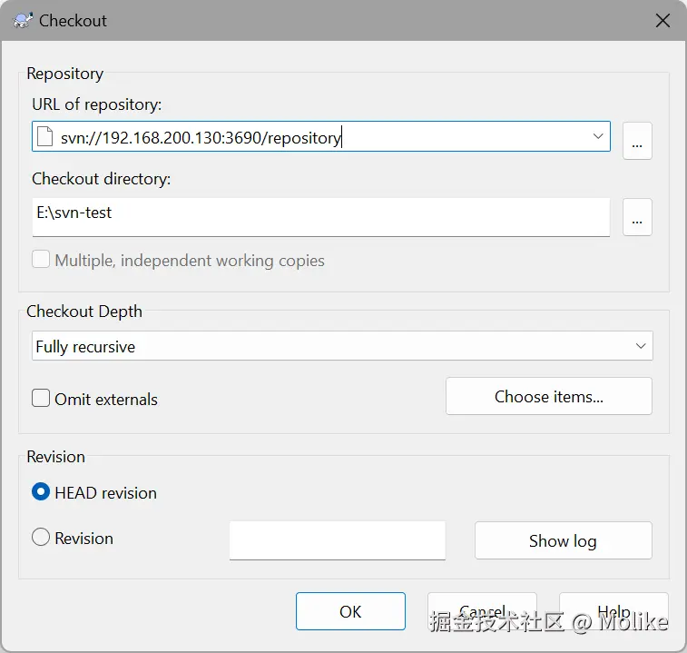 输入连接地址 svn://192.168.200.130:3690/repository 点击OK