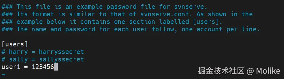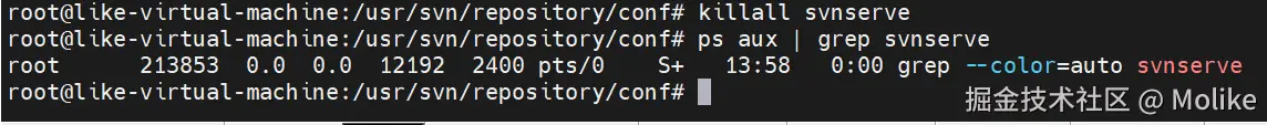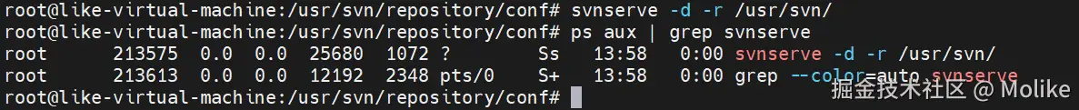 然后再用启动命令启动SVN,这样访问服务器时就可以直接用"svn://服务器ip/repository"来连接了