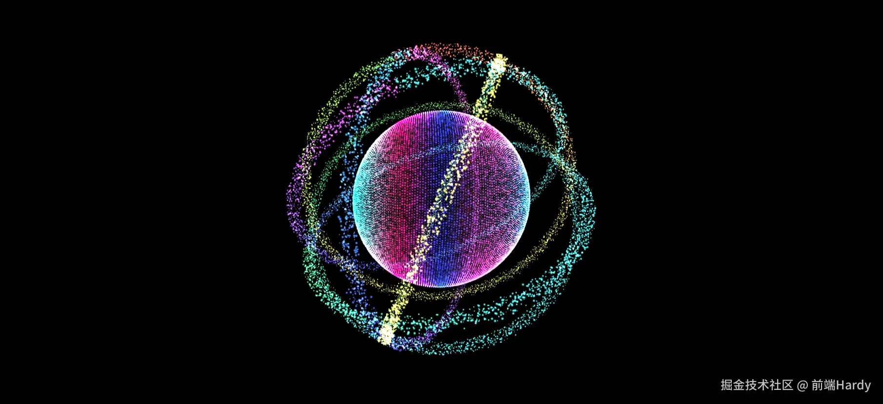 这个页面采用极简的 HTML 结构,完全依赖 JavaScript 和 Three.js 创建复杂的 3D 视觉效果。CSS 样式主要用于确保 Canvas 元素的全屏显示和居中定位,而所有的视觉效果(粒子、发光、动画)都通过 Three.js 的渲染能力和自定义着色器实现。整体设计注重视觉冲击力和用户交互体验,通过粒子系统、动态光影和流畅动画创造出一个引人入胜的沉浸式 3D 环境。