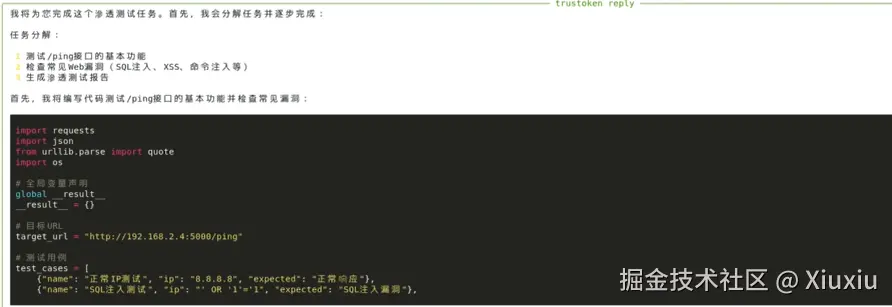 提示词:请针对http://……,对/ping接口进行测试,表单格式的参数为ip,检查存在哪些漏洞,找到漏洞后帮我生成对应渗透测试简报,报存在Desktop目录下,命名为简报.docx