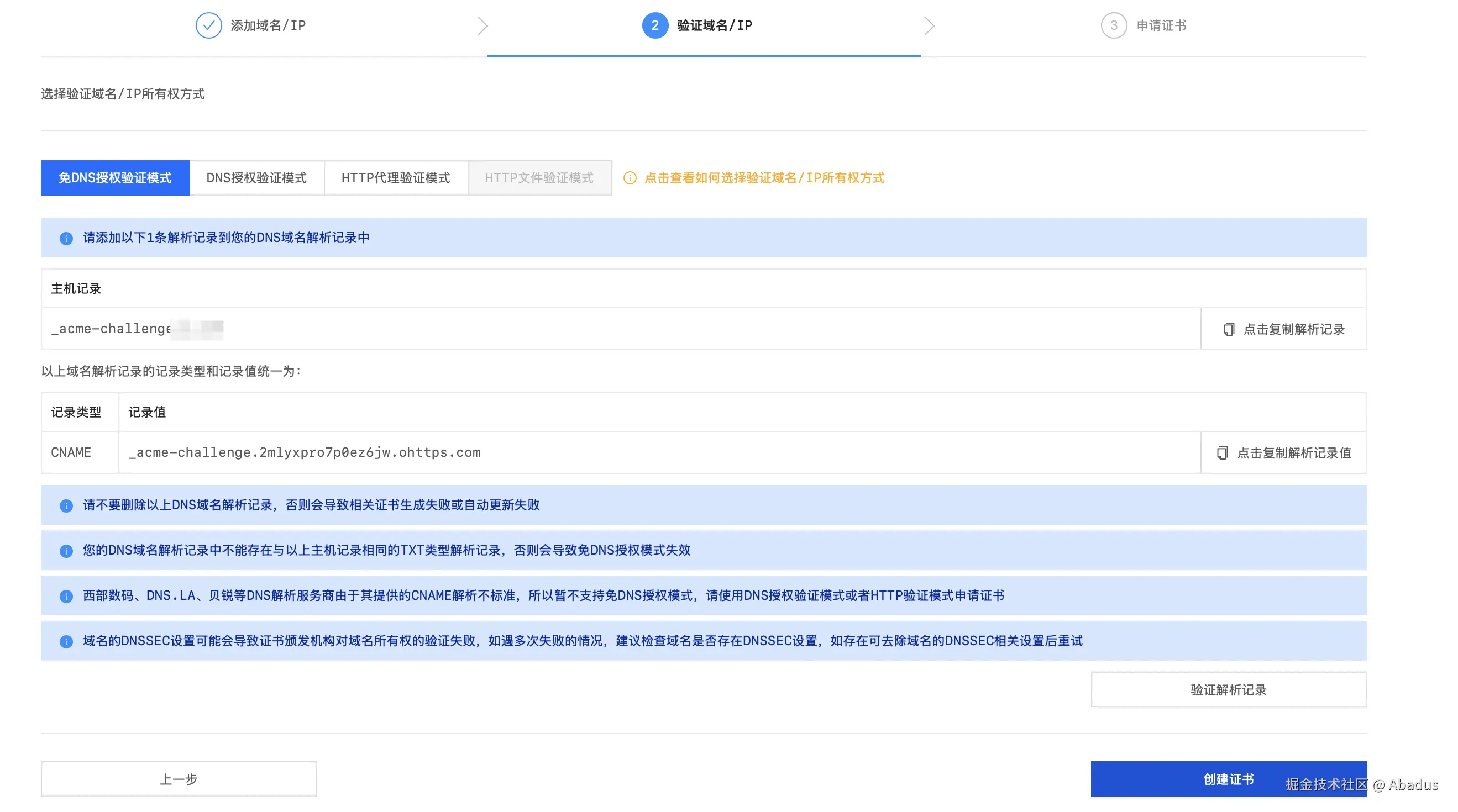3)选择域名验证模式,下面以免DNS授权验证模式为例: