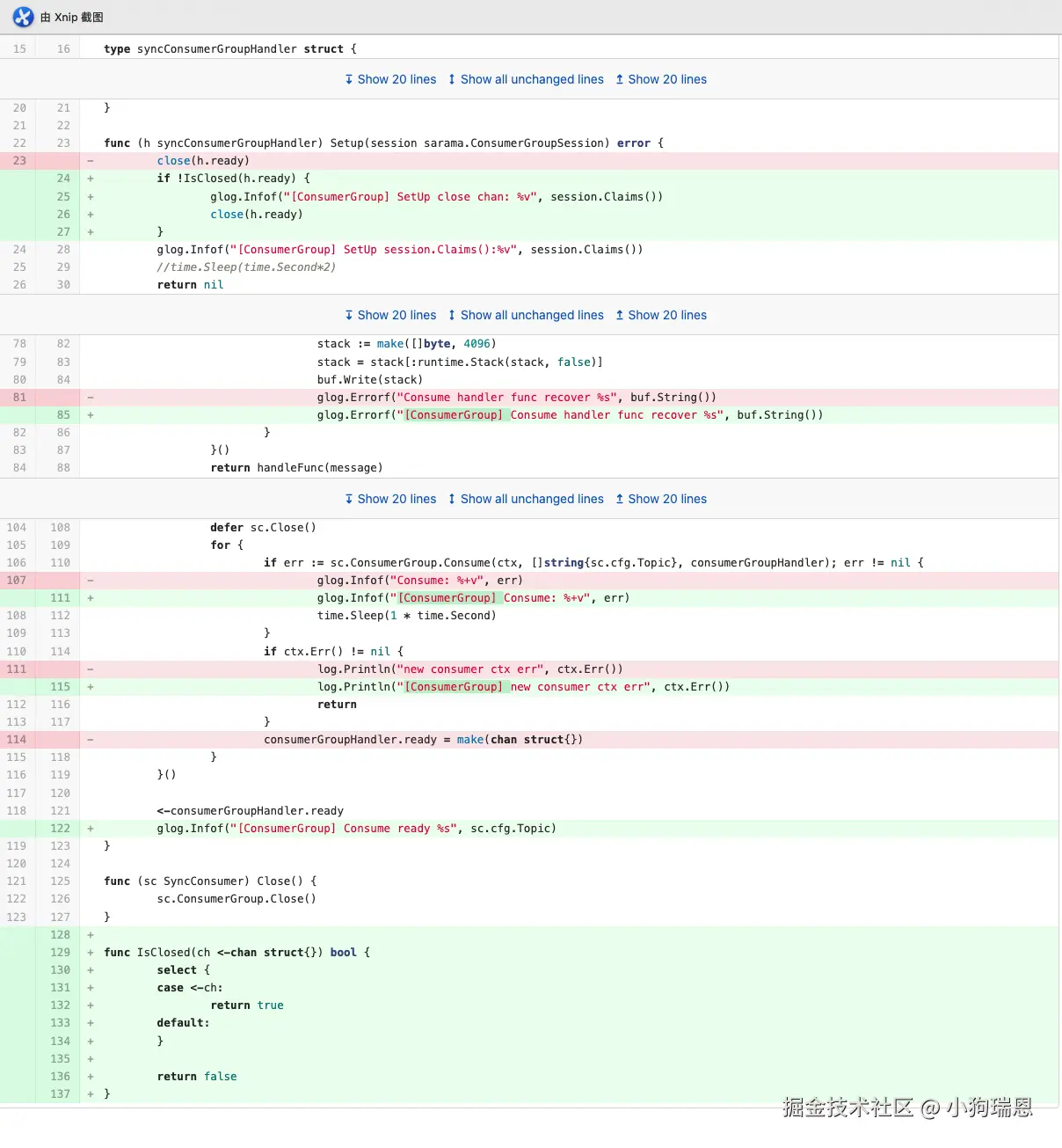 因为每次消费组重平衡的时候,client.Consumer方法都会退出,所以sarama官方的例子中要求Consume should be called inside an infinite loop;每次重平衡完成,Setup方法都会被再次调用,如果不重新初始化channel,同一个channel会被关闭两次,在Golang中会引起panic!