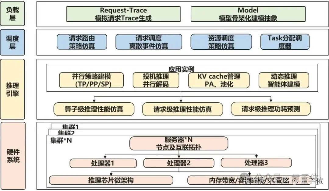 分析硬件架构:从芯片微架构(如 3D Cube 张量加速引擎)到整个集群的网络拓扑(如多台服务器怎么互联),全方位模拟硬件性能。