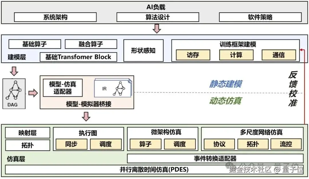 具体的方法叫做动静态融合的大规模训练集群建模仿真,可以通过模块化拼装 AI 任务流程,像搭积木一样灵活构建复杂模型,快速分析计算、内存和通信的资源消耗。