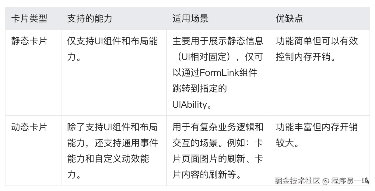 这两种类型的卡片,在整体的运行框架和渲染流程上是一样的,主要的区别是在于静态卡片渲染服务将卡片内容渲染完毕后,卡片的使用方会使用最后一帧渲染的数据作为静态图片显示,其次卡片渲染服务中的卡片实例也会释放该卡片的所有运行资源以节省内存;这样就会导致频繁的刷新会使得静态卡片运行时资源不断的创建和销毁,增加卡片功耗。