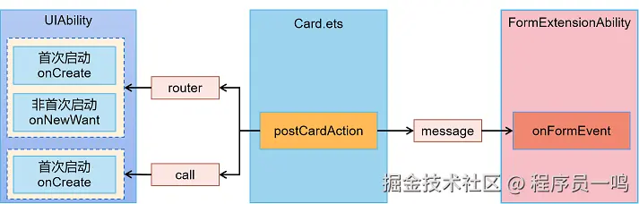 动态卡片中,官方提供了postCardAction接口用于动态卡片内部和提供方应用间的交互,和静态一致,也是仅支持router、message和call三种类型的事件,并且只能在卡片控件的点击事件中可以调用。