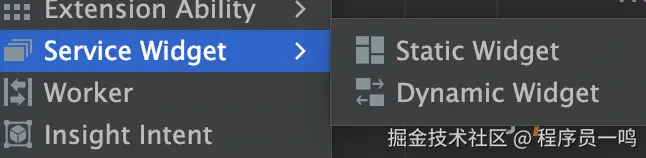 当我们去创建一个卡片时,可以发现,有两种选择,一种是Static Widget,也就是静态卡片,另一种是Dynamic Widget,也就是动态卡片,在对应的模块右键点后,找到服务卡片Seivice Widget,如下图所示: