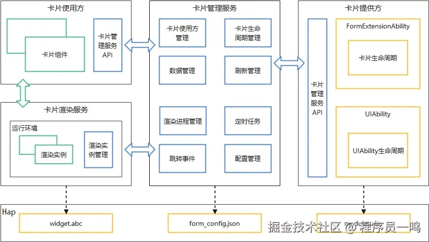 具体的实现原理主要牵扯到四个,分别是卡片使用方,卡片提供方,卡片管理服务和卡片渲染服务。