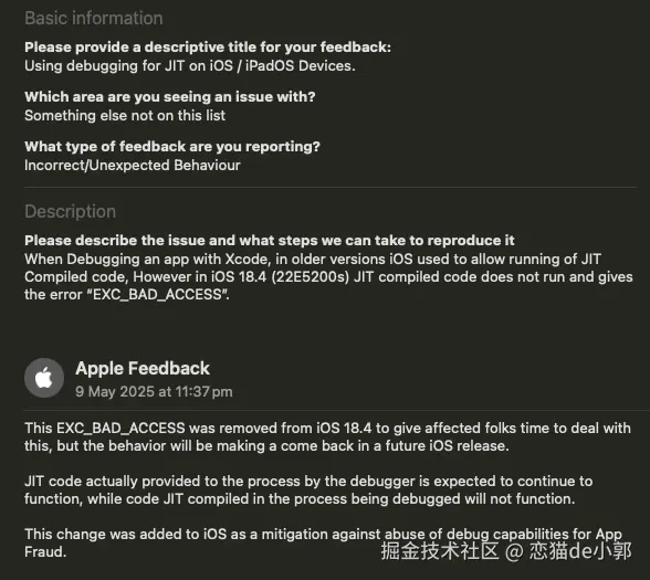 而这个问题后来在 iOS 18.4 beta2 又可以正常使用了,原因是因为 EXC_BAD_ACCESS 从 iOS 18.4 中删除时没有提前通知,导致不少人出现问题来不及反应,所以官方最终回滚了这个操作,但也说了在未来的 iOS 版本中会“卷土重来”。