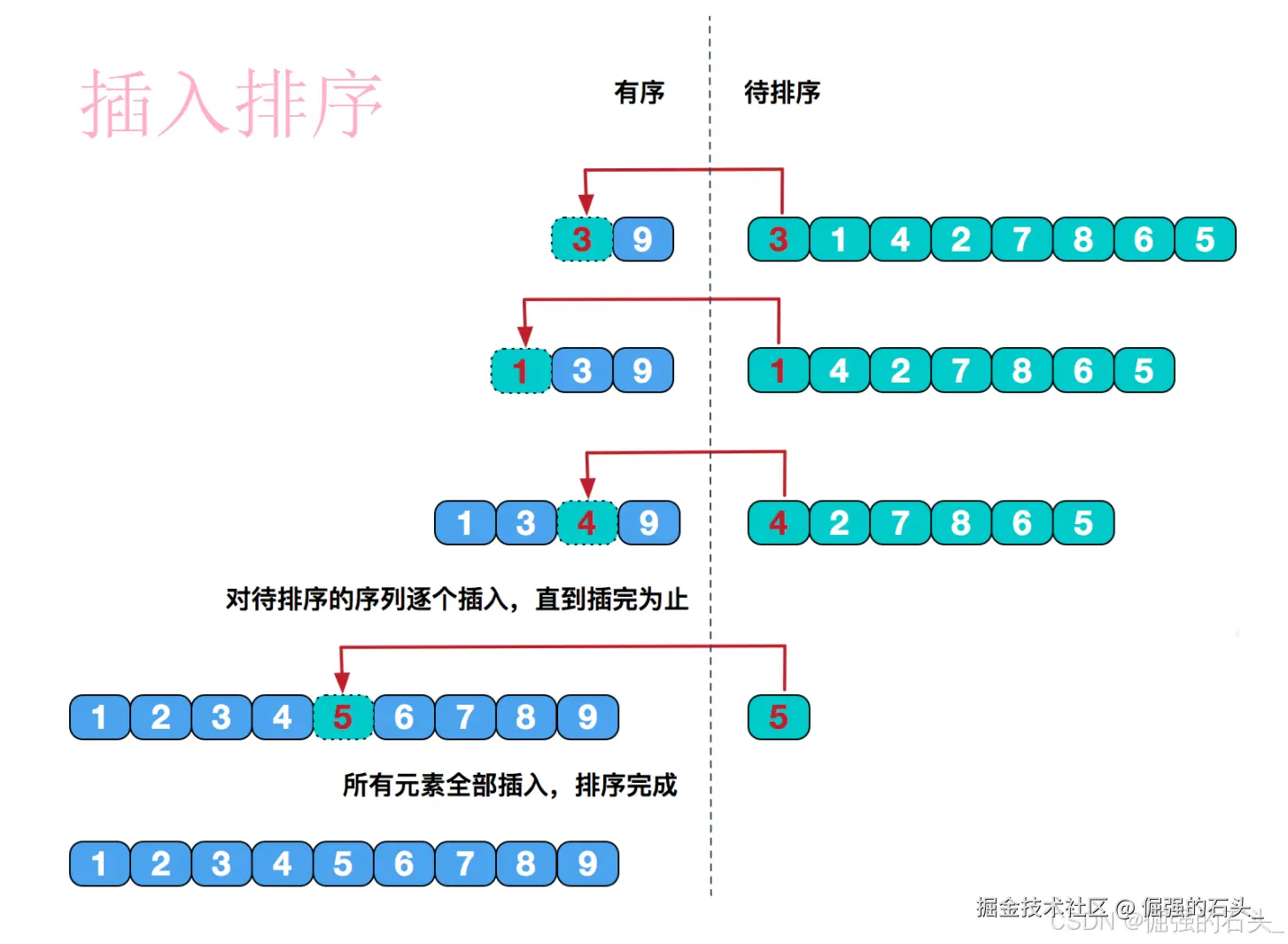 重复步骤2~5,直到所有元素都排序完成。