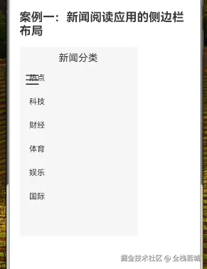 侧边栏内容是SideBarContainer的第一个子组件,我们使用Column组件作为容器,包含一个标题和一个新闻分类列表。