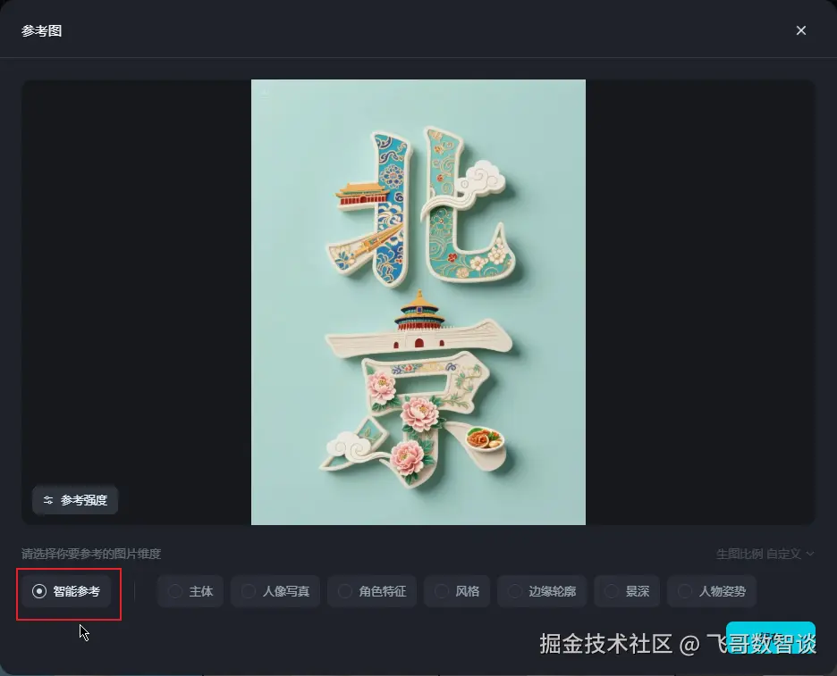 “即梦3.0”的效果在前面很多文章中都有介绍,尤其是文字方面更是独领风骚,但 2.0 的“智能参考”功能一直没有更新到 3.0,略显瑕疵。