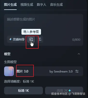 导入需要的参考图,模型选择“图片3.0”。