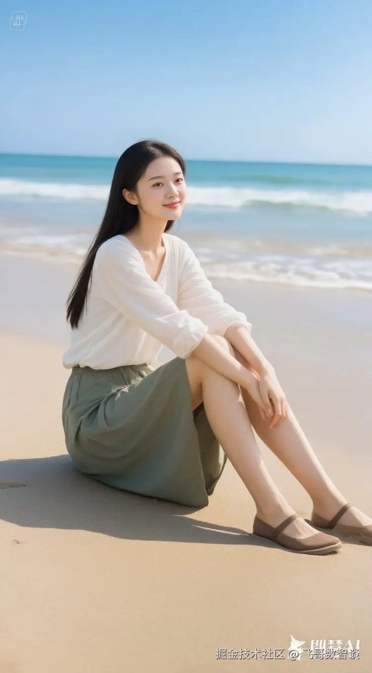 美女坐在海边沙滩上