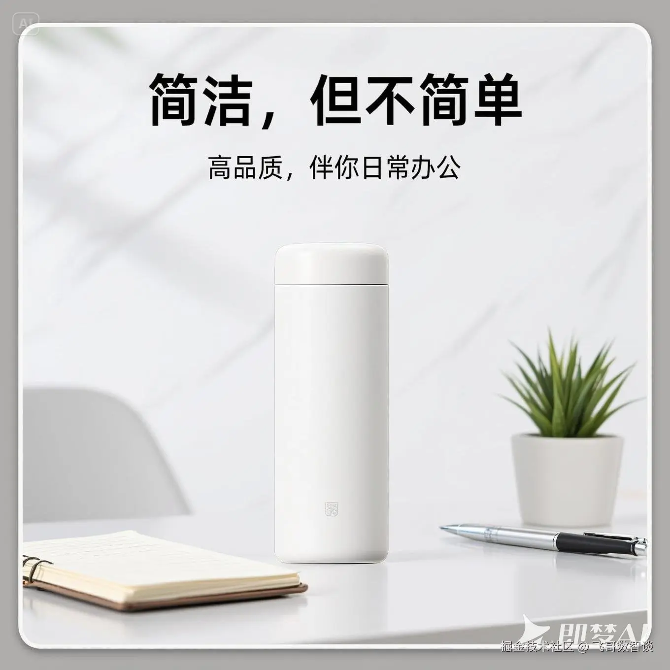 为商品生成一个电商封面图,商品放在一张简洁的办公桌上,图片上部放置宣传语“简洁,但不简单”