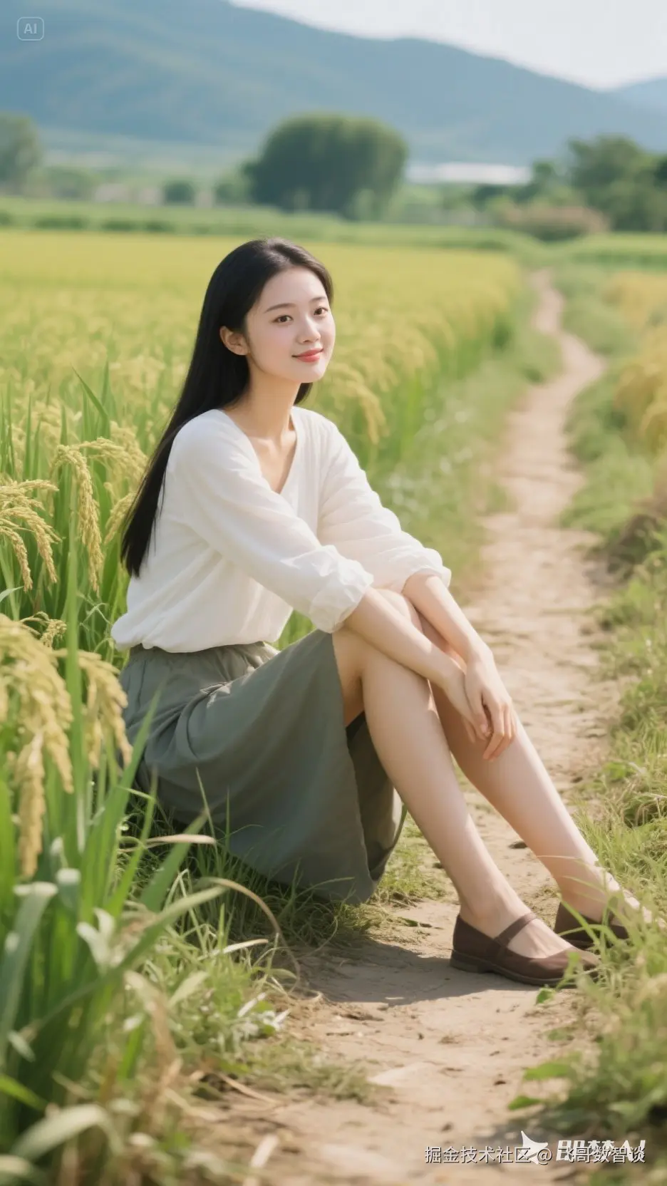 一张美女坐在田垄的照片,我们直接更改姿态,让其站在海边沙滩上。