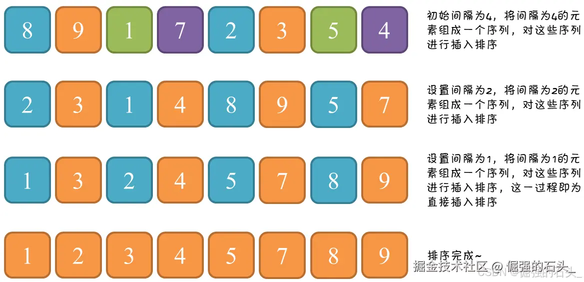 ,即对于某个变量gap,序列中所有距离为gap的元素之间是有序的。随着变量gap的逐渐减小,当gap减小到1时,整个序列恰好被“基本有序”,此时再对全体元素进行一次直接插入排序即可