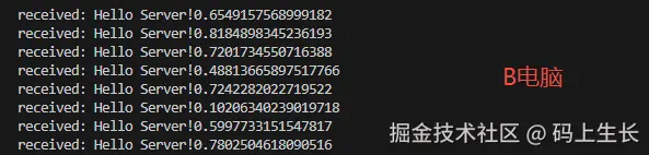 接下来,在A电脑上创建一个新的WebSocket客户端实例,连接到B电脑的WebSocket服务器,用于发送消息: