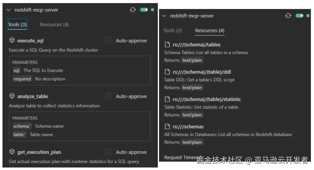 在 Cline 中配置好开发的 Redshift MCP Server 之后,在 Cline 的已安装 MCP Tab 页可以看到该 MCP Server 提供的 Tools 和 Resources。