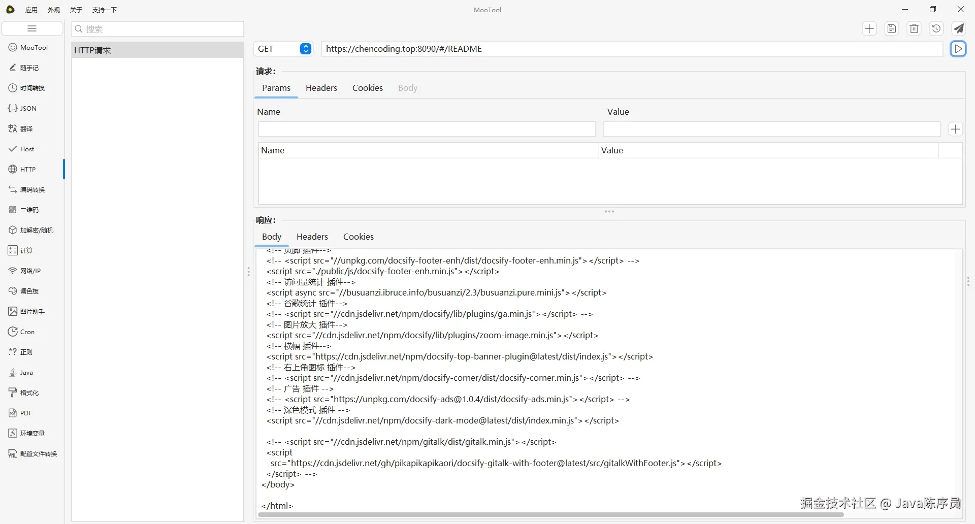 - 常用开发工具:提供 JSON 格式化、HTTP 请求、加解密、Cron 表达式、正则表达式、代码格式化等工具