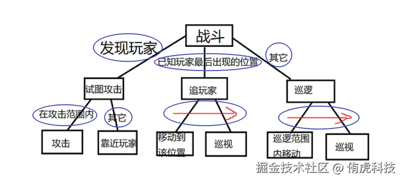 好像多了几个圈?那现在,请你将这些圈也视为和「攻击」一样类型的节点。这样一来,我们将「判断逻辑」、「顺序遍历(图中的红色箭头)」、「动作」都用节点来表示了。这有什么好处呢?好处就在于我们可以将它们进行各种各样的组合!比如,如果有一个怪物比较胆小,遇到玩家后会逃跑,我们就可以用图中的「发现玩家」+「移动到该位置(逃跑的位置)」来实现;也可以配合新的节点来组合,比如「已知玩家最后出现的位置」+ 新节点:「朝指定位置开火」,就可以实现远程追击。