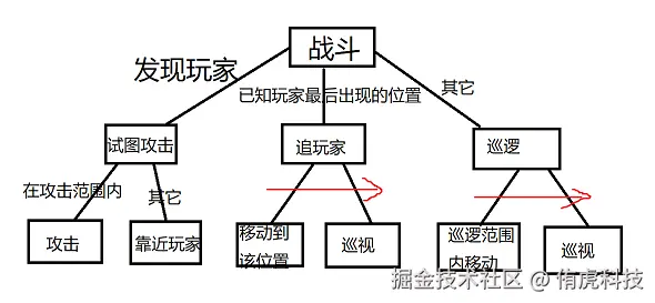假设「攻击」动作的逻辑是「向玩家挥一拳」,现在怪物发现玩家且玩家在攻击范围内。那么,按照行为树的逻辑,它会经过「战斗 ➡ 试图攻击 ➡ 攻击」一路下来,最终向玩家挥出一拳。