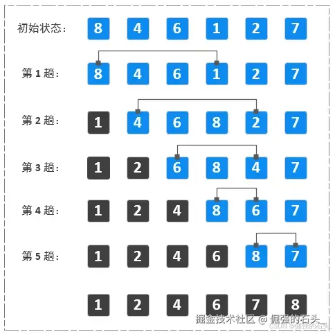 - 交换:将找到的最小(或最大)的元素与未排序区间的第一个元素进行交换,该元素即为未排序区间的最小值(或最大值),因此交换后,它就到了已排序区间的末尾。