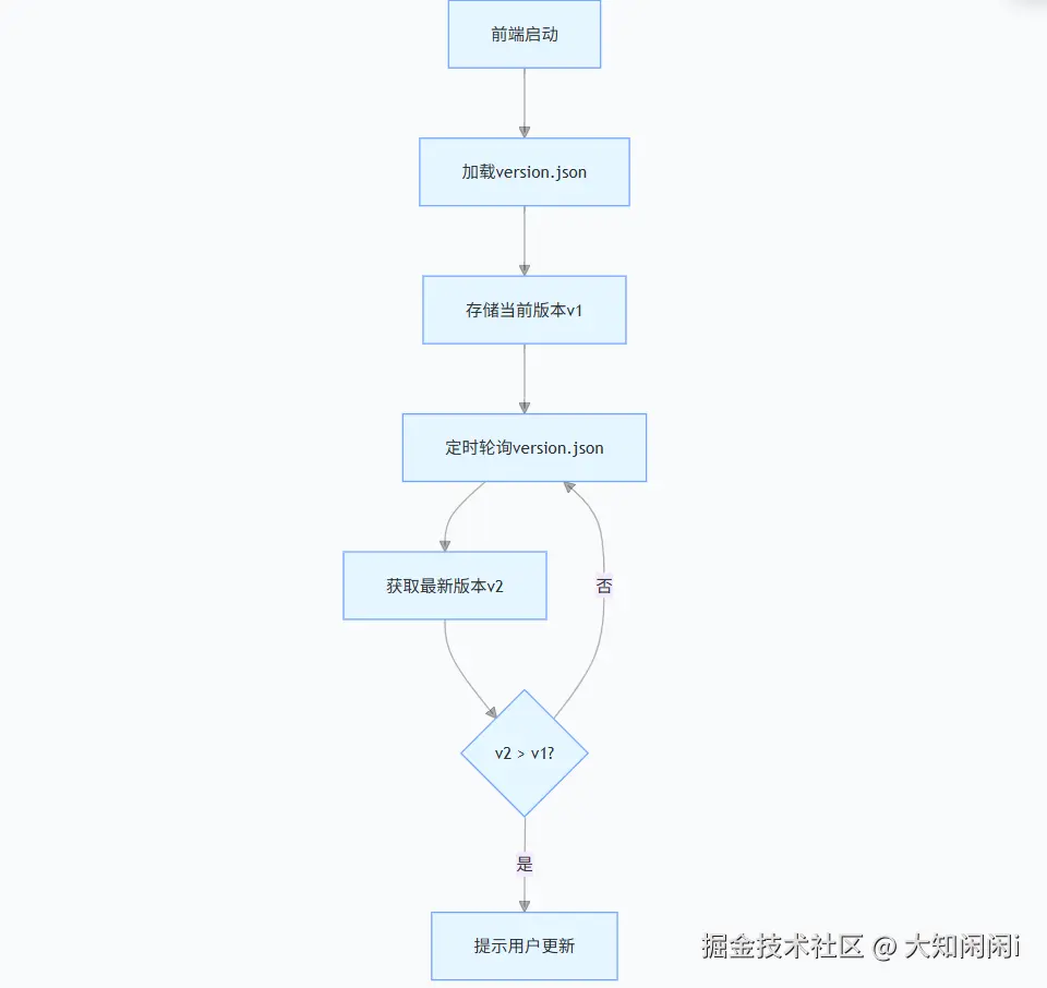 通过对比前后版本标识实现更新检测,核心流程如下: