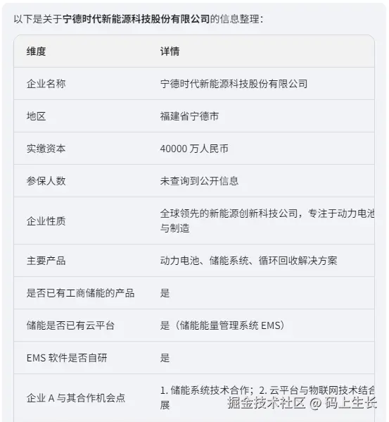 - 使用“储能企业调研专家”AI智能体进行后续的企业调研工作,简化和高效收集企业相关信息,虽然不是百分百正确,但是相对于人工存在的收集完整性和效率问题,稍有出入还是可以接受的,毕竟,最终还是要深入去和销售沟通的,当前的工作只是做一下筛选,已经可以满足需求了。